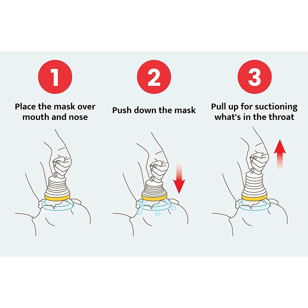 ResQ-Air™ eliminates fear from choking emergencies. No more worries about breaking ribs or doing it wrong. Place the mask over the mouth, pull the handle, and watch as the blockage is safely removed in seconds. Works even when your hands are shaking with fear.